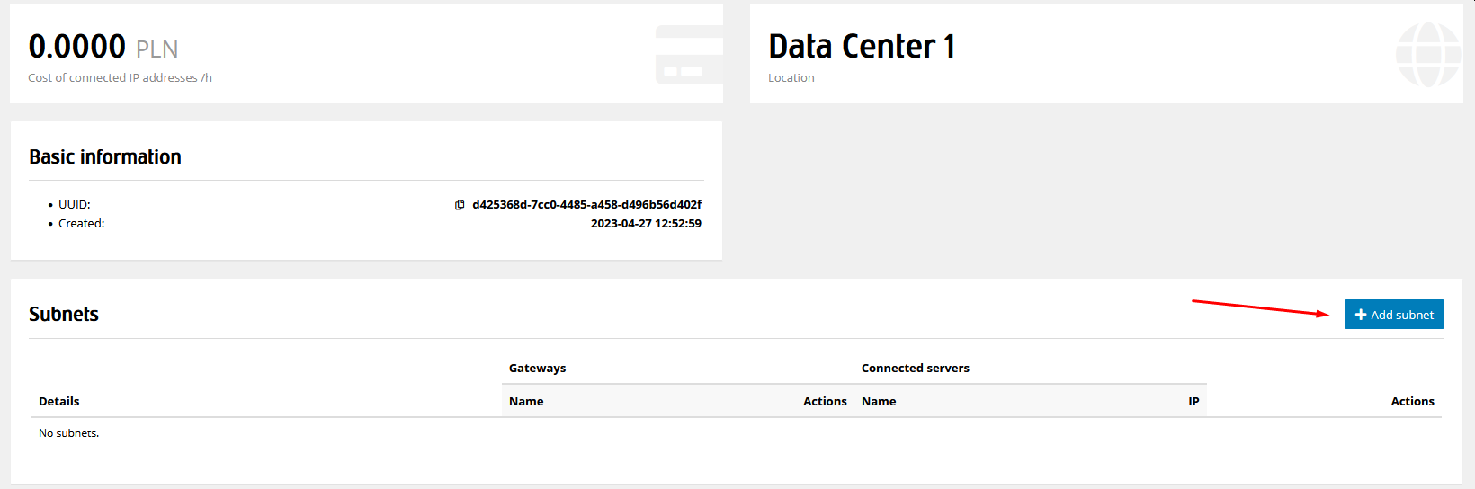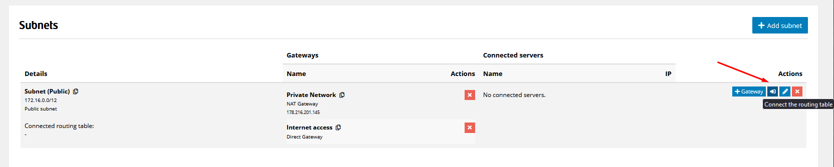 With the subnet ready, we need to add a gateway to it. To do this, click on the Gateway button.