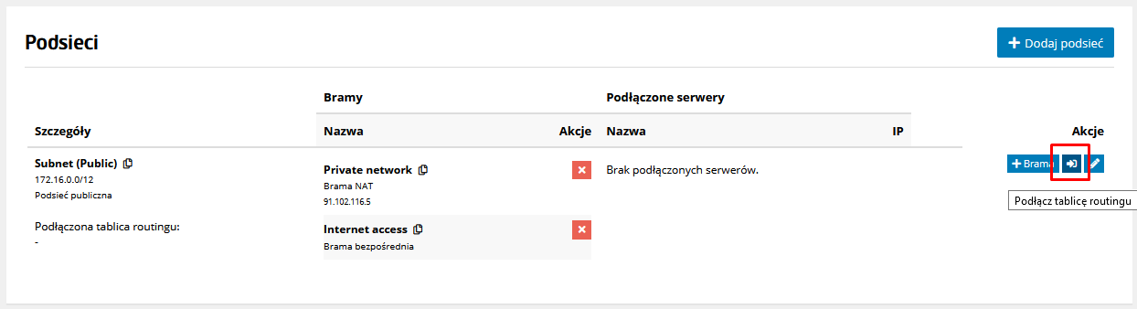 Mając gotową podsieć, musimy dodać do niej bramę, w tym celu klikamy na przycisk Brama.